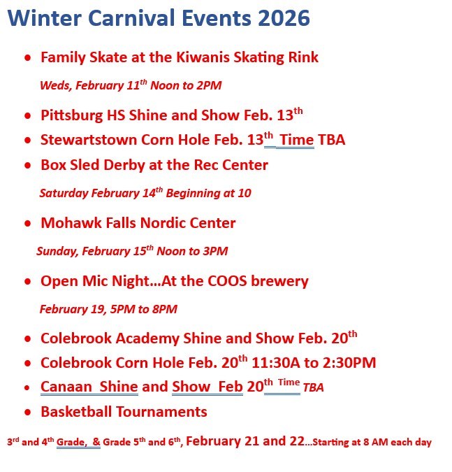 December: The Giving Tree, first Saturday of the month. Winter Coffeehouse and carols. Canaan Naturally Connected Monthly Meeting every 2nd Wednesday. Please refer to our Destination website http://canaanvt.com; [email protected]; Facebook page Canaan Naturally Connected, Inc. for events.